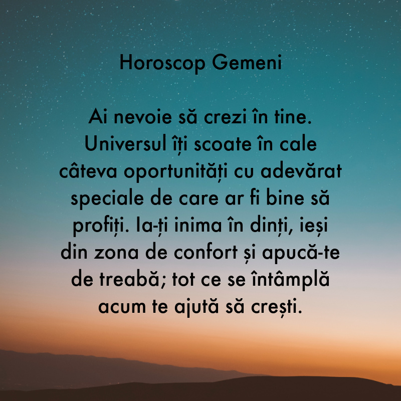 Ai nevoie să crezi în tine. Universul îți scoate în cale câteva oportunități cu adevărat speciale de care ar fi bine să profiți. Ia-ți inima în dinți, ieși din zona de confort și apucă-te de treabă; tot ce se întâmplă acum te ajută să crești.