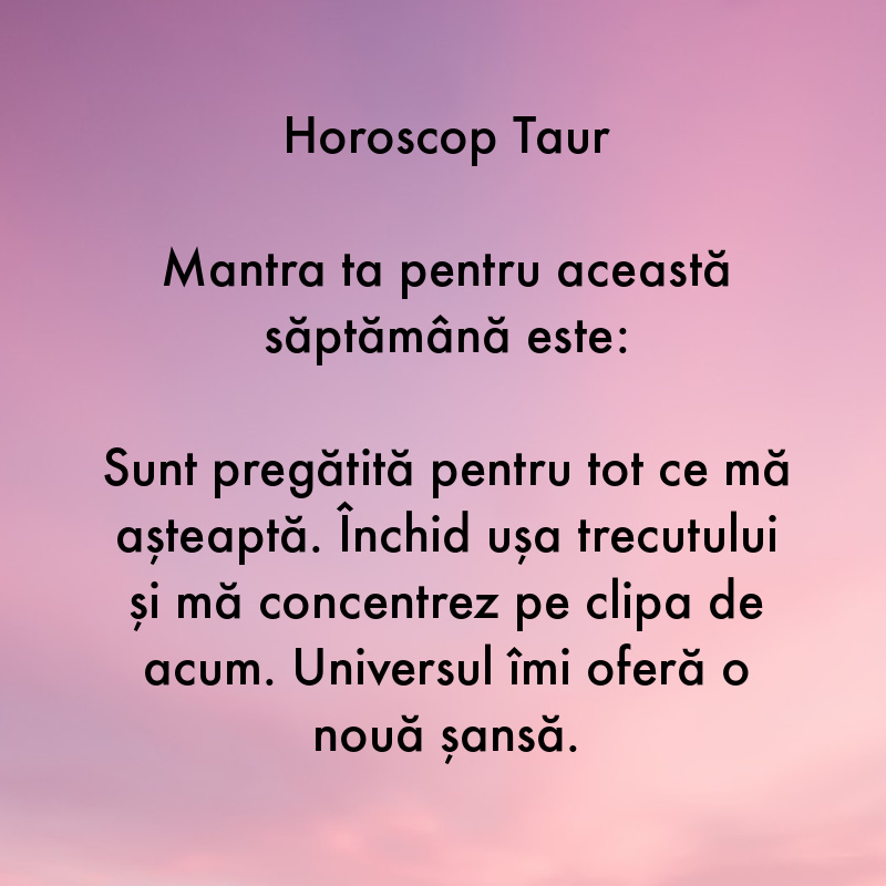 Mantra ta pentru această săptămână este: Sunt pregătită pentru tot ce mă așteaptă. Închid ușa trecutului și mă concentrez pe clipa de acum. Universul îmi oferă o nouă șansă.