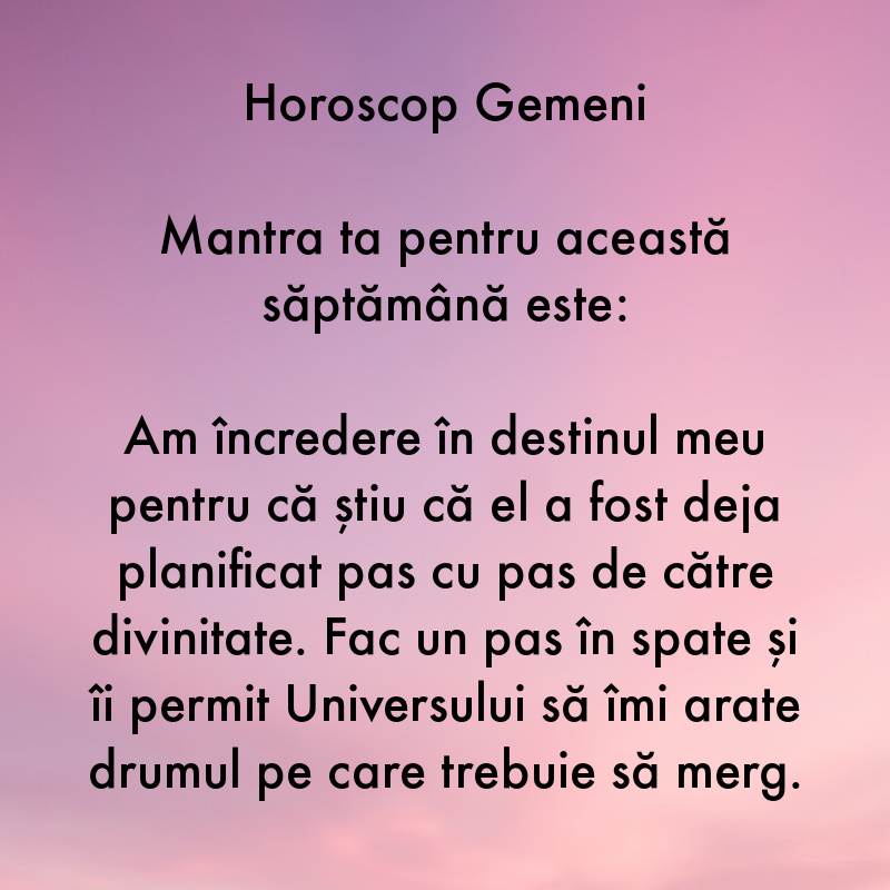 Mantra ta pentru această săptămână este: Am încredere în destinul meu pentru că știu că el a fost deja planificat pas cu pas de către divinitate. Fac un pas în spate și îi permit Universului să îmi arate drumul pe care trebuie să merg.