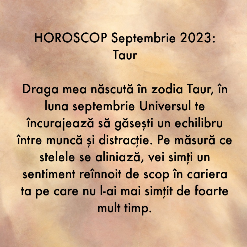 Draga mea născută în zodia Taur, în luna septembrie Universul te încurajează să găsești un echilibru între muncă și distracție. Pe măsură ce stelele se aliniază, vei simți un sentiment reînnoit de scop în cariera ta pe care nu l-ai mai simțit de foarte mult timp. Îți faci planuri mărețe pentru final de an pentru că vrei să bifezi câteva visuri pe care le ai înainte ca 2023 să se încheie.