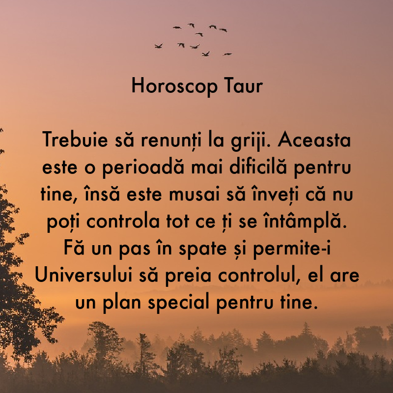 Trebuie să renunți la griji. Aceasta este o perioadă mai dificilă pentru tine, însă este musai să înveți că nu poți controla tot ce ți se întâmplă. Fă un pas în spate și permite-i Universului să preia controlul, el are un plan special pentru tine.