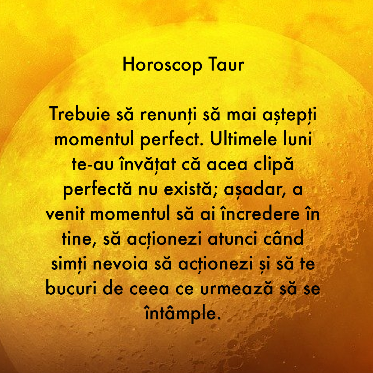 Trebuie să renunți să mai aștepți momentul perfect. Ultimele luni te-au învățat că acea clipă perfectă nu există; așadar, a venit momentul să ai încredere în tine, să acționezi atunci când simți nevoia să acționezi și să te bucuri de ceea ce urmează să se întâmple.