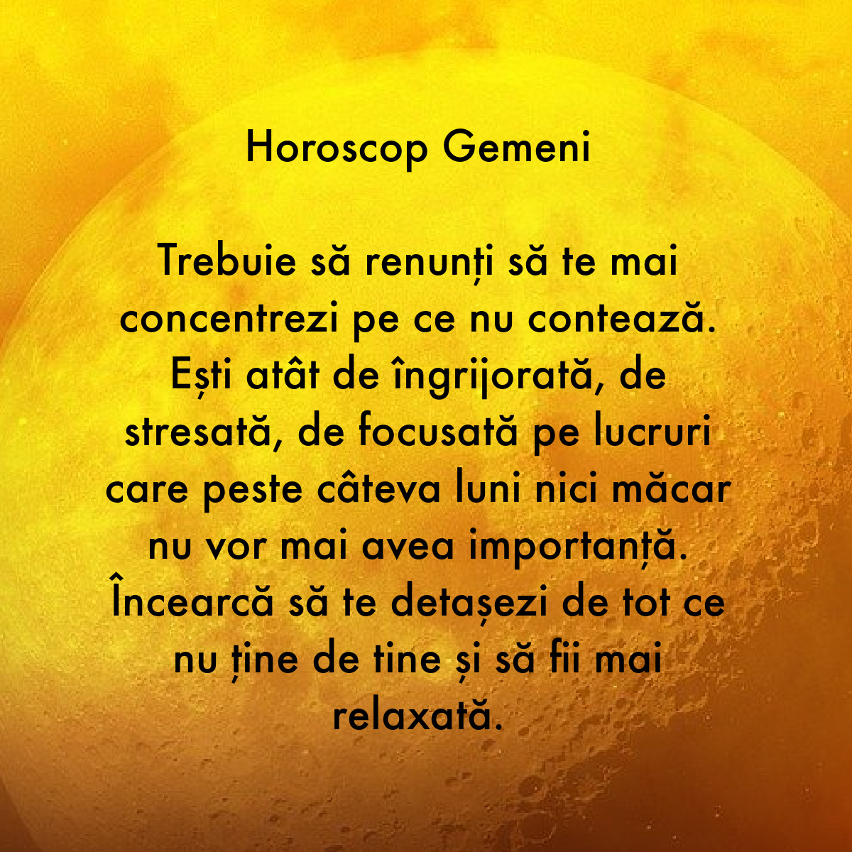 Trebuie să renunți să te mai concentrezi pe ce nu contează. Ești atât de îngrijorată, de stresată, de focusată pe lucruri care peste câteva luni nici măcar nu vor mai avea importanță. Încearcă să te detașezi de tot ce nu ține de tine și să fii mai relaxată.