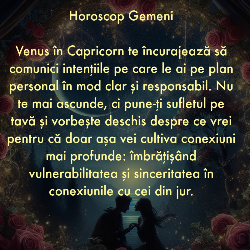 Venus în Capricorn te încurajează să comunici intențiile pe care le ai pe plan personal în mod clar și responsabil. Nu te mai ascunde, ci pune-ți sufletul pe tavă și vorbește deschis despre ce vrei pentru că doar așa vei cultiva conexiuni mai profunde: îmbrățișând vulnerabilitatea și sinceritatea în conexiunile cu cei din jur.
