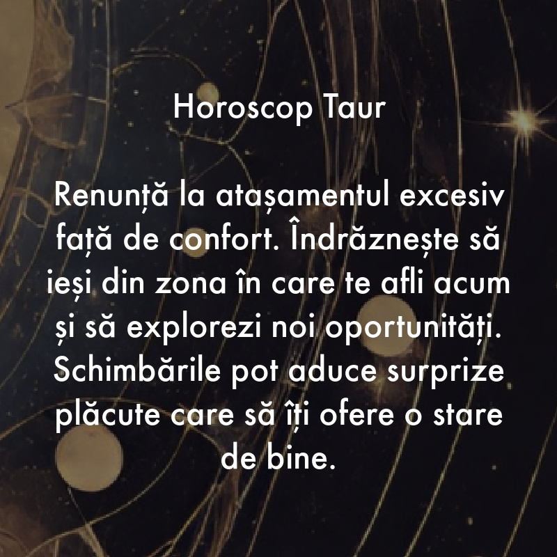 Renunță la atașamentul excesiv față de confort. Îndrăznește să ieși din zona în care te afli acum și să explorezi noi oportunități. Schimbările pot aduce surprize plăcute care să îți ofere o stare de bine.