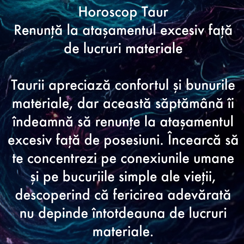 Taurii apreciază confortul și bunurile materiale, dar această săptămână îi îndeamnă să renunțe la atașamentul excesiv față de posesiuni. Încearcă să te concentrezi pe conexiunile umane și pe bucuriile simple ale vieții, descoperind că fericirea adevărată nu depinde întotdeauna de lucruri materiale.