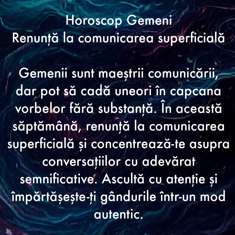Gemenii sunt maeștrii comunicării, dar pot să cadă uneori în capcana vorbelor fără substanță. În această săptămână, renunță la comunicarea superficială și concentrează-te asupra conversațiilor cu adevărat semnificative. Ascultă cu atenție și împărtășește-ți gândurile într-un mod autentic.