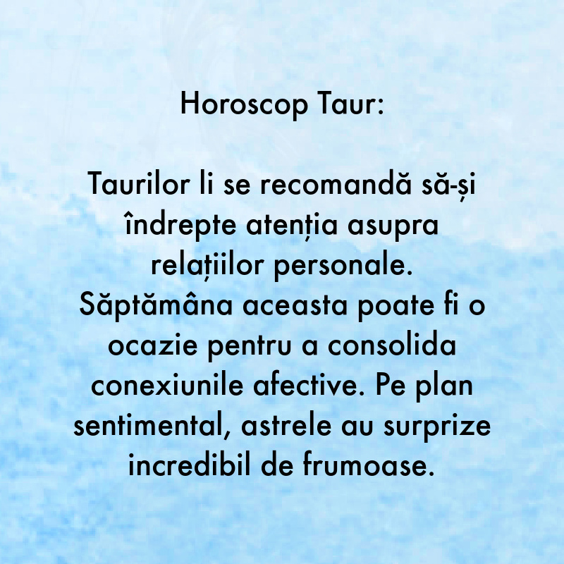 Taurilor li se recomandă să-și îndrepte atenția asupra relațiilor personale. Săptămâna aceasta poate fi o ocazie pentru a consolida conexiunile afective. Pe plan sentimental, astrele au surprize incredibil de frumoase.