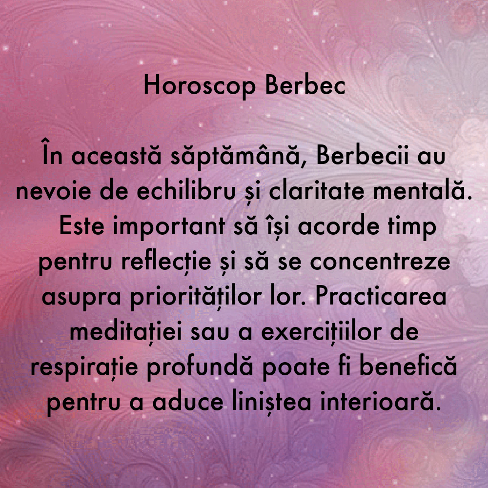În această săptămână, Berbecii au nevoie de echilibru și claritate mentală. Este important să își acorde timp pentru reflecție și să se concentreze asupra priorităților lor. Practicarea meditației sau a exercițiilor de respirație profundă poate fi benefică pentru a aduce liniștea interioară.