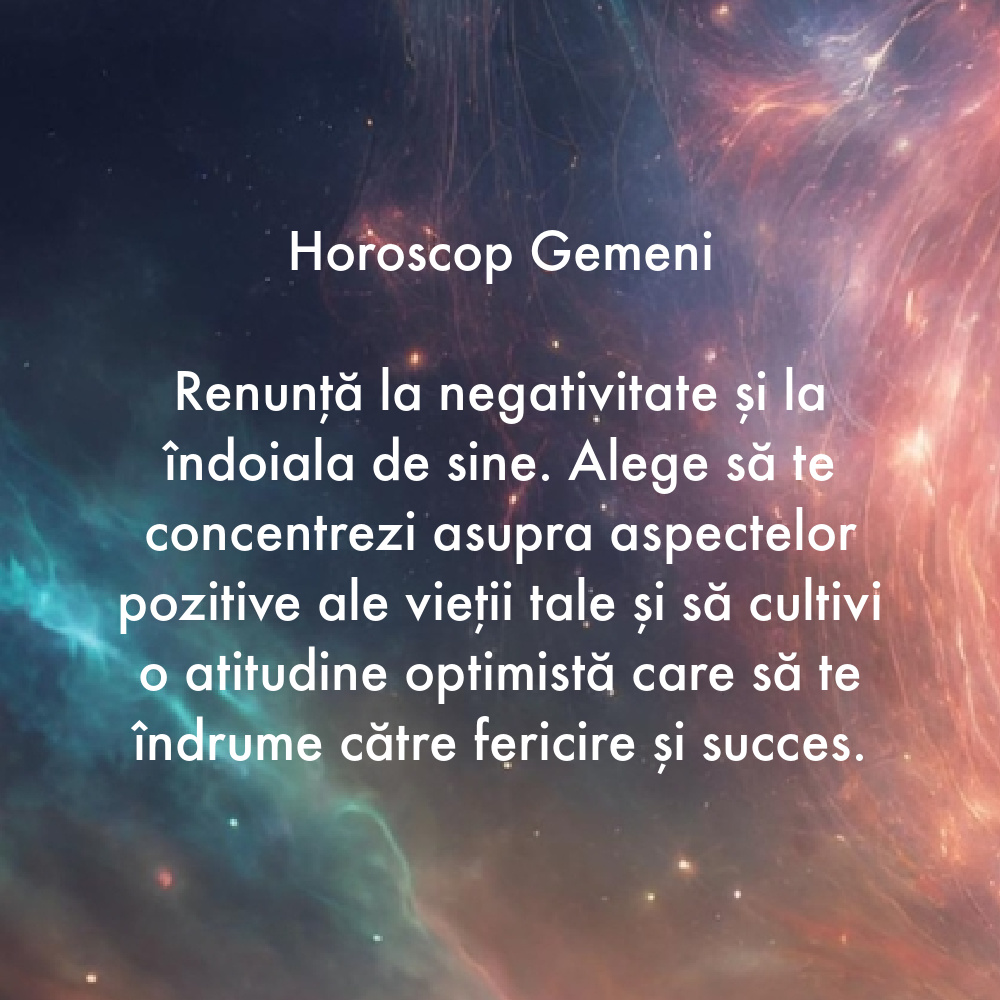 Renunță la negativitate și la îndoiala de sine. Alege să te concentrezi asupra aspectelor pozitive ale vieții tale și să cultivi o atitudine optimistă care să te îndrume către fericire și succes.