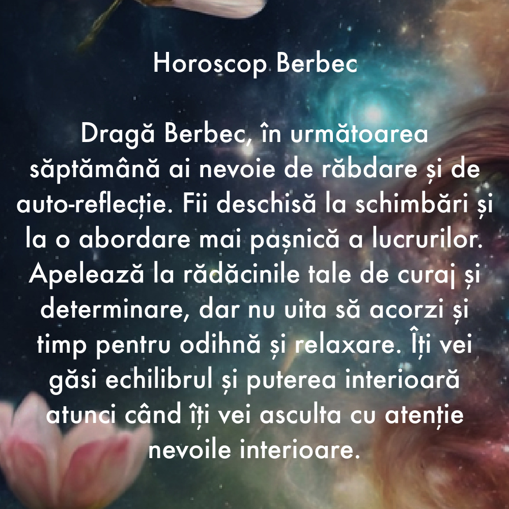 Dragă Berbec, în următoarea săptămână ai nevoie de răbdare și de auto-reflecție. Fii deschisă la schimbări și la o abordare mai pașnică a lucrurilor. Apelează la rădăcinile tale de curaj și determinare, dar nu uita să acorzi și timp pentru odihnă și relaxare. Îți vei găsi echilibrul și puterea interioară atunci când îți vei asculta cu atenție nevoile interioare.