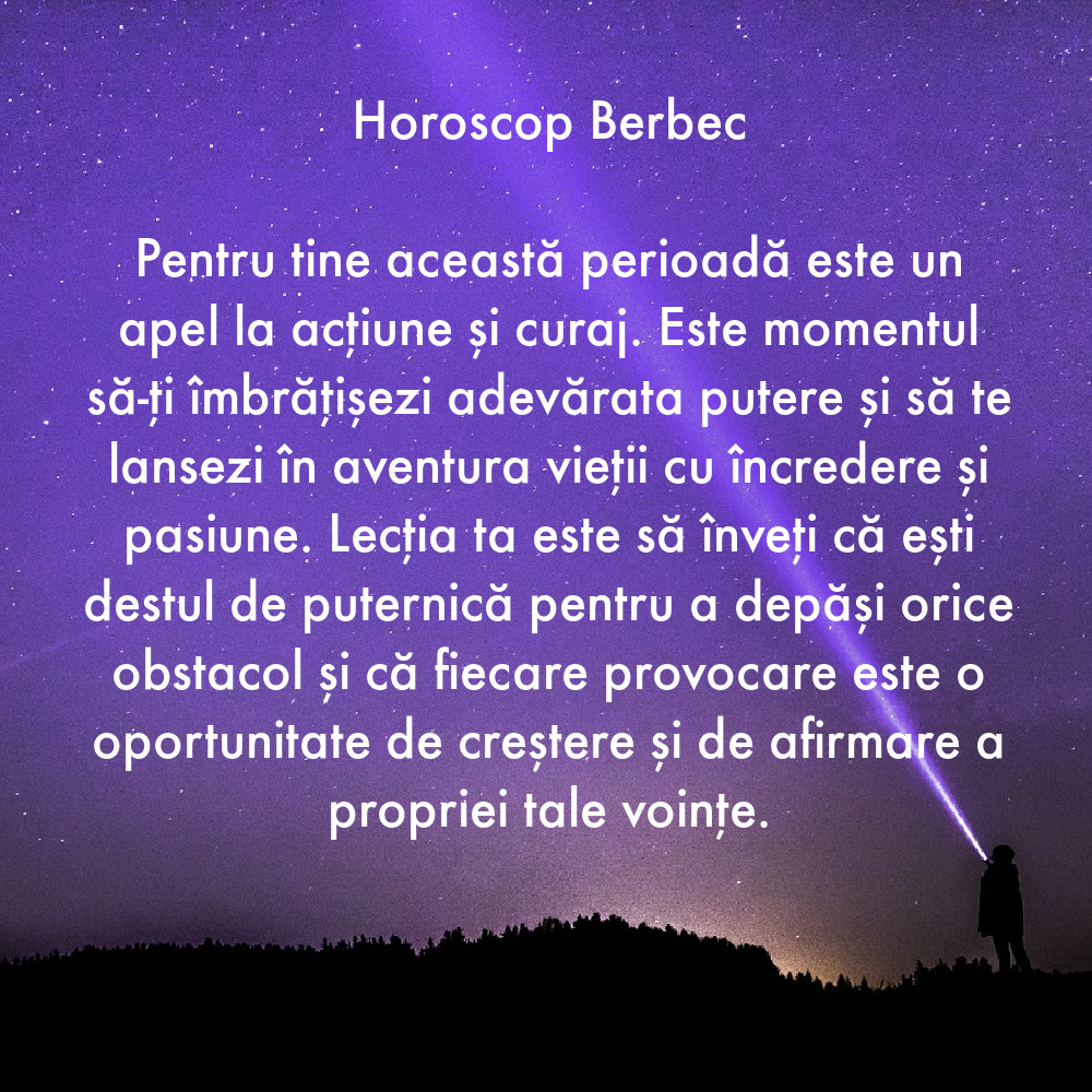 Pentru tine începutul sezonului Berbecului este o chemare către acțiune și hotărâre. Este momentul să-ți asumi rolul de lider și să-ți urmezi pasiunile și aspirațiile cu încredere și determinare. Lecția ta este să înveți că echilibrul și armonia nu vin din evitarea conflictului, ci din confruntarea cu el și din căutarea unor soluții constructive.