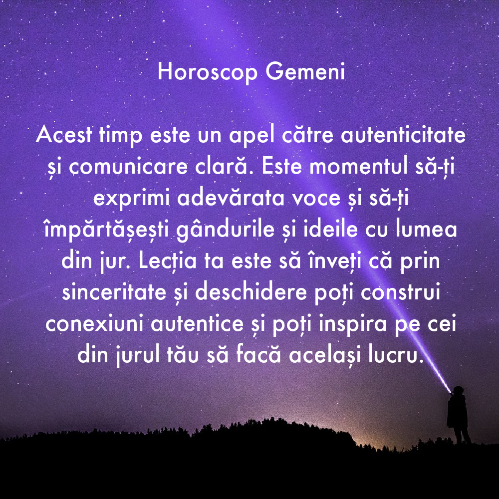 Acest timp este un apel către autenticitate și comunicare clară. Este momentul să-ți exprimi adevărata voce și să-ți împărtășești gândurile și ideile cu lumea din jur. Lecția ta este să înveți că prin sinceritate și deschidere poți construi conexiuni autentice și poți inspira pe cei din jurul tău să facă același lucru.