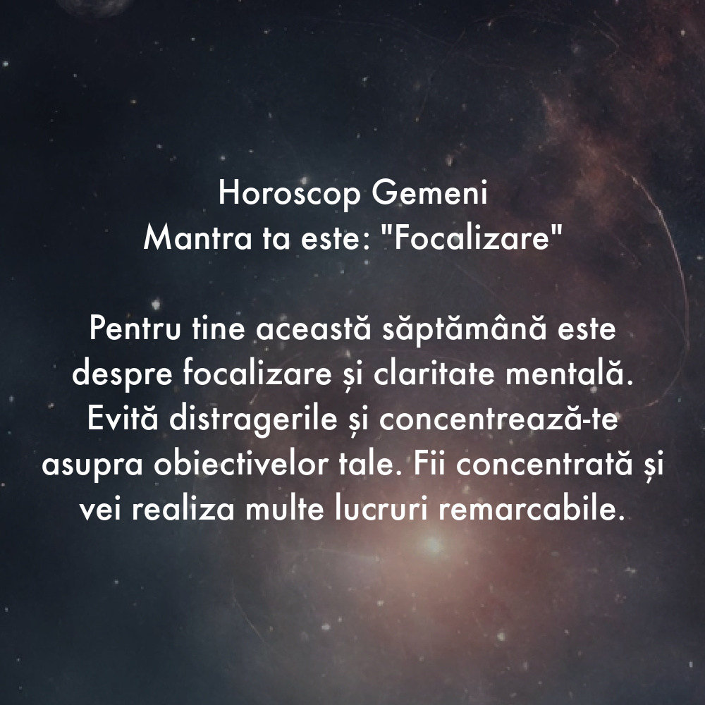 Pentru tine această săptămână este despre focalizare și claritate mentală. Evită distragerile și concentrează-te asupra obiectivelor tale. Fii concentrată și vei realiza multe lucruri remarcabile.