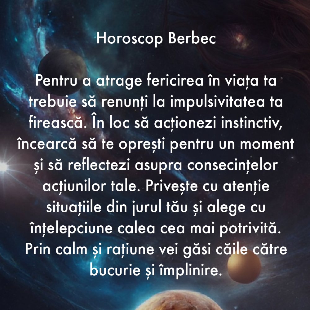 Pentru a atrage fericirea în viața ta trebuie să renunți la impulsivitatea ta firească. În loc să acționezi instinctiv, încearcă să te oprești pentru un moment și să reflectezi asupra consecințelor acțiunilor tale. Privește cu atenție situațiile din jurul tău și alege cu înțelepciune calea cea mai potrivită. Prin calm și rațiune vei găsi căile către bucurie și împlinire.