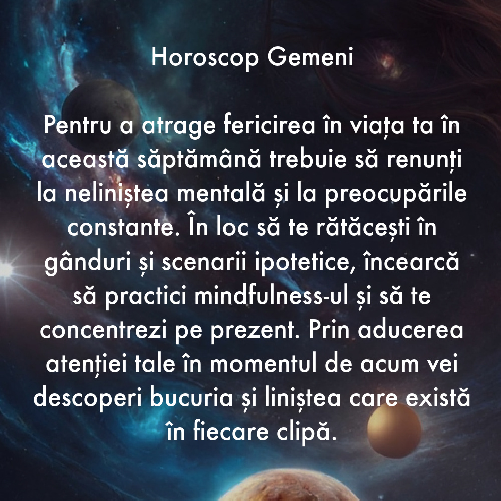 Pentru a atrage fericirea în viața ta în această săptămână trebuie să renunți la neliniștea mentală și la preocupările constante. În loc să te rătăcești în gânduri și scenarii ipotetice, încearcă să practici mindfulness-ul și să te concentrezi pe prezent. Prin aducerea atenției tale în momentul de acum vei descoperi bucuria și liniștea care există în fiecare clipă.