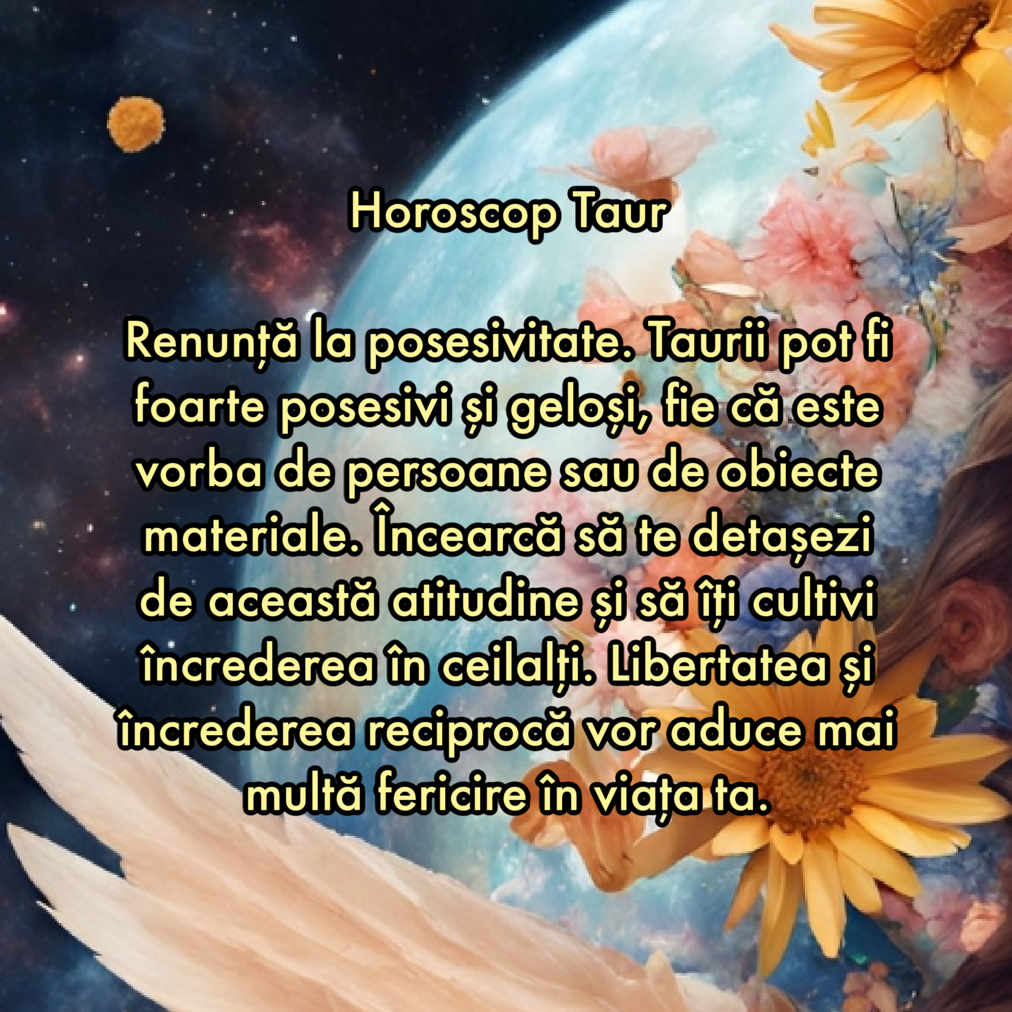 Renunță la posesivitate. Taurii pot fi foarte posesivi și geloși, fie că este vorba de persoane sau de obiecte materiale. Încearcă să te detașezi de această atitudine și să îți cultivi încrederea în ceilalți. Libertatea și încrederea reciprocă vor aduce mai multă fericire în viața ta.