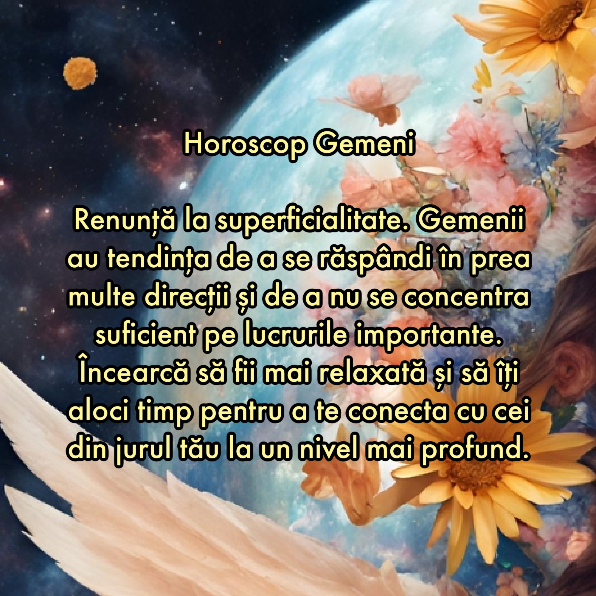 Renunță la superficialitate. Gemenii au tendința de a se răspândi în prea multe direcții și de a nu se concentra suficient pe lucrurile importante. Încearcă să fii mai relaxată și să îți aloci timp pentru a te conecta cu cei din jurul tău la un nivel mai profund.