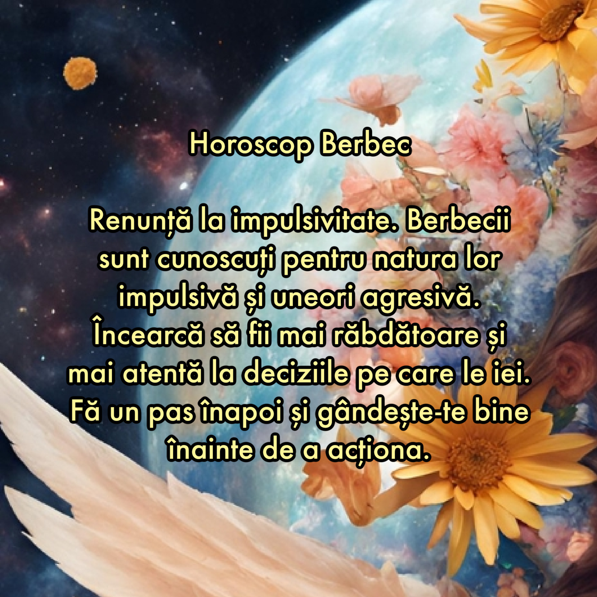 Renunță la impulsivitate. Berbecii sunt cunoscuți pentru natura lor impulsivă și uneori agresivă. Încearcă să fii mai răbdătoare și mai atentă la deciziile pe care le iei. Fă un pas înapoi și gândește-te bine înainte de a acționa.