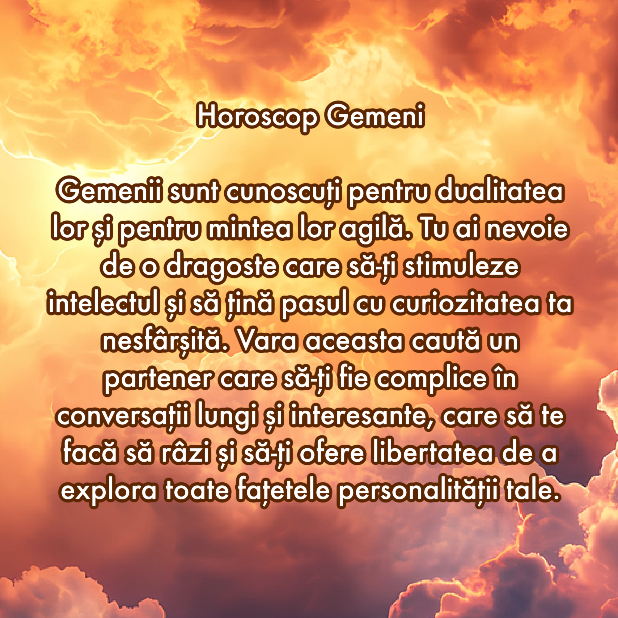 Gemenii sunt cunoscuți pentru dualitatea lor și pentru mintea lor agilă. Tu ai nevoie de o dragoste care să-ți stimuleze intelectul și să țină pasul cu curiozitatea ta nesfârșită. Vara aceasta caută un partener care să-ți fie complice în conversații lungi și interesante, care să te facă să râzi și să-ți ofere libertatea de a explora toate fațetele personalității tale.