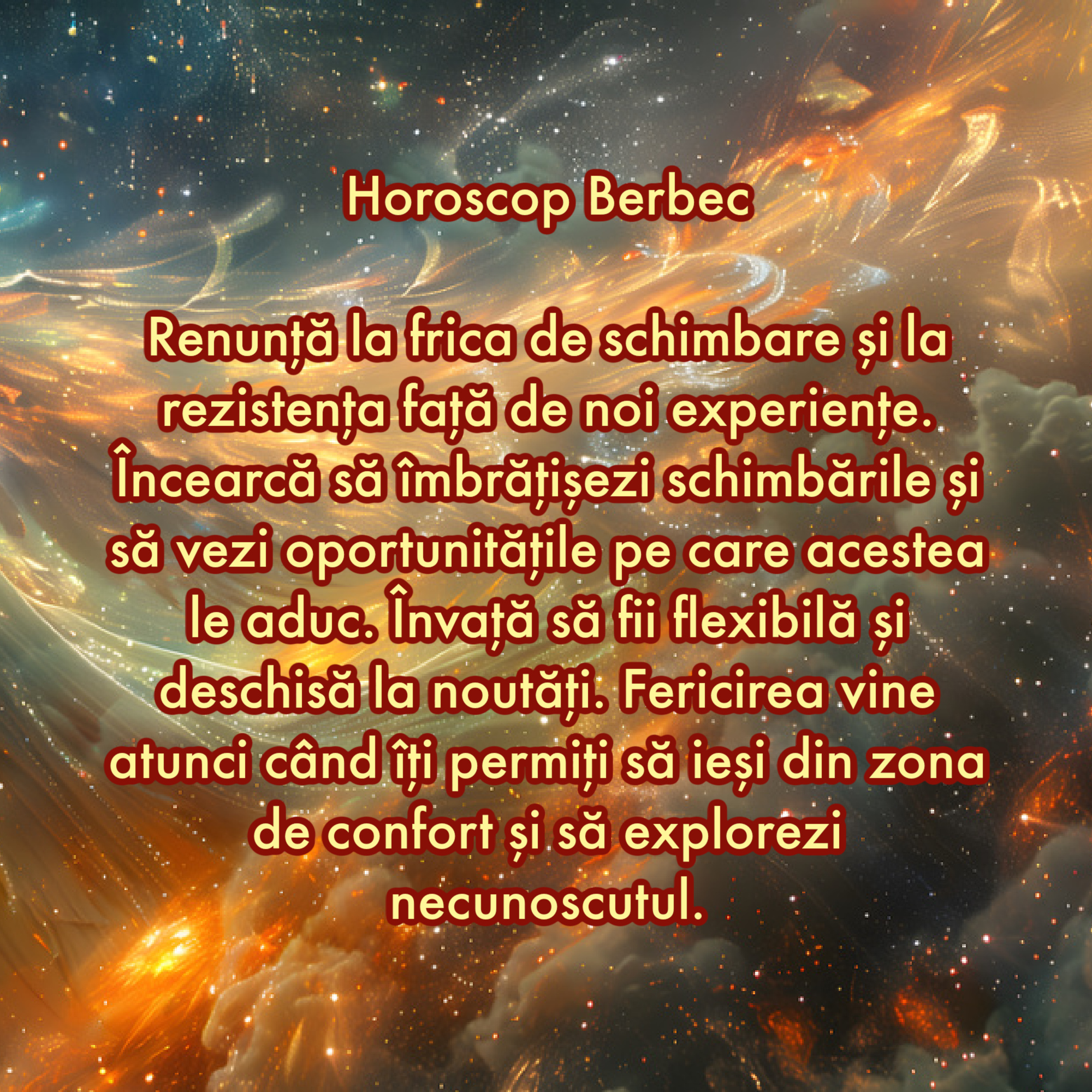 Renunță la frica de schimbare și la rezistența față de noi experiențe. Încearcă să îmbrățișezi schimbările și să vezi oportunitățile pe care acestea le aduc. Învață să fii flexibilă și deschisă la noutăți. Fericirea vine atunci când îți permiți să ieși din zona de confort și să explorezi necunoscutul.