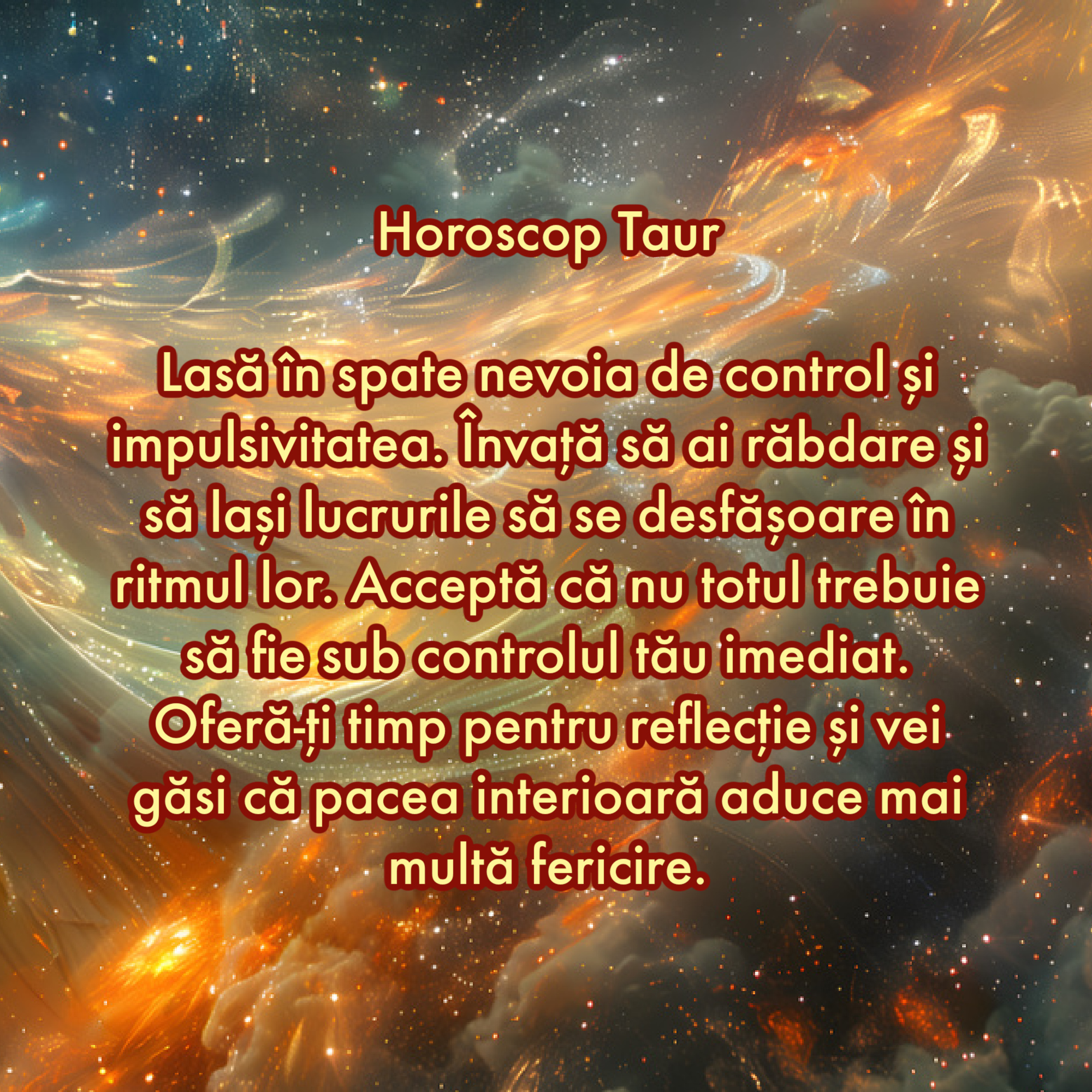 Lasă în spate nevoia de control și impulsivitatea. Învață să ai răbdare și să lași lucrurile să se desfășoare în ritmul lor. Acceptă că nu totul trebuie să fie sub controlul tău imediat. Oferă-ți timp pentru reflecție și vei găsi că pacea interioară aduce mai multă fericire.