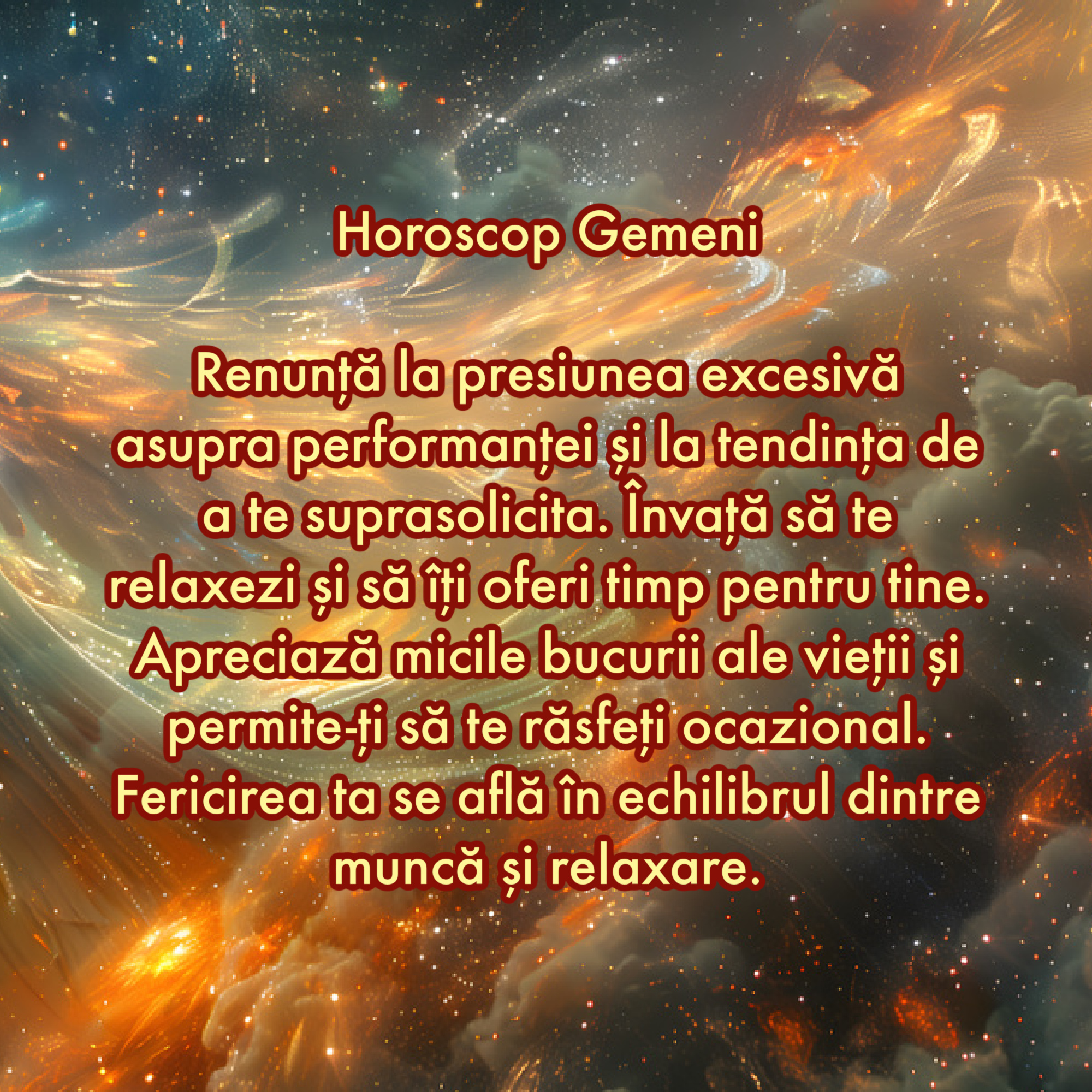 Renunță la presiunea excesivă asupra performanței și la tendința de a te suprasolicita. Învață să te relaxezi și să îți oferi timp pentru tine. Apreciază micile bucurii ale vieții și permite-ți să te răsfeți ocazional. Fericirea ta se află în echilibrul dintre muncă și relaxare.