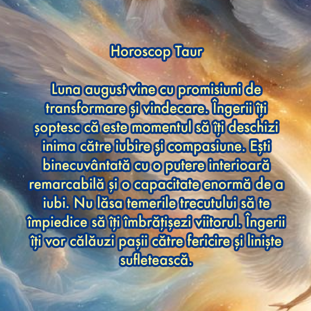 Luna august vine cu promisiuni de transformare și vindecare. Îngerii îți șoptesc că este momentul să îți deschizi inima către iubire și compasiune. Ești binecuvântată cu o putere interioară remarcabilă și o capacitate enormă de a iubi. Nu lăsa temerile trecutului să te împiedice să îți îmbrățișezi viitorul. Îngerii îți vor călăuzi pașii către fericire și liniște sufletească.