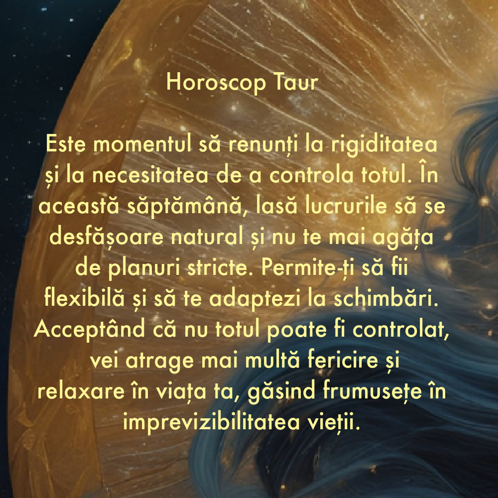 Este momentul să renunți la rigiditatea și la necesitatea de a controla totul. În această săptămână, lasă lucrurile să se desfășoare natural și nu te mai agăța de planuri stricte. Permite-ți să fii flexibilă și să te adaptezi la schimbări. Acceptând că nu totul poate fi controlat, vei atrage mai multă fericire și relaxare în viața ta, găsind frumusețe în imprevizibilitatea vieții.