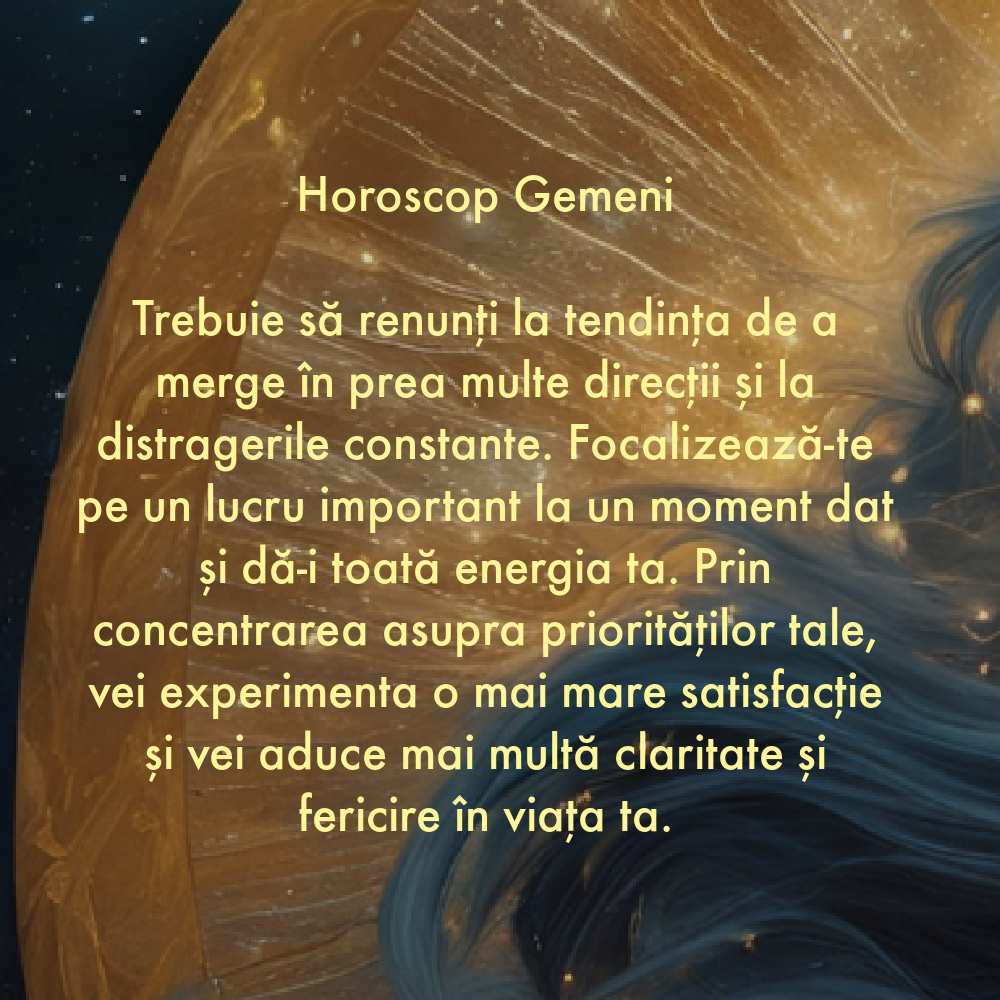 Trebuie să renunți la tendința de a merge în prea multe direcții și la distragerile constante. Focalizează-te pe un lucru important la un moment dat și dă-i toată energia ta. Prin concentrarea asupra priorităților tale, vei experimenta o mai mare satisfacție și vei aduce mai multă claritate și fericire în viața ta.