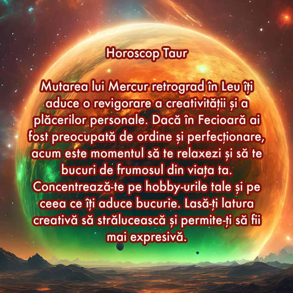 Mutarea lui Mercur retrograd în Leu îți aduce o revigorare a creativității și a plăcerilor personale. Dacă în Fecioară ai fost preocupată de ordine și perfecționare, acum este momentul să te relaxezi și să te bucuri de frumosul din viața ta. Concentrează-te pe hobby-urile tale și pe ceea ce îți aduce bucurie. Lasă-ți latura creativă să strălucească și permite-ți să fii mai expresivă.