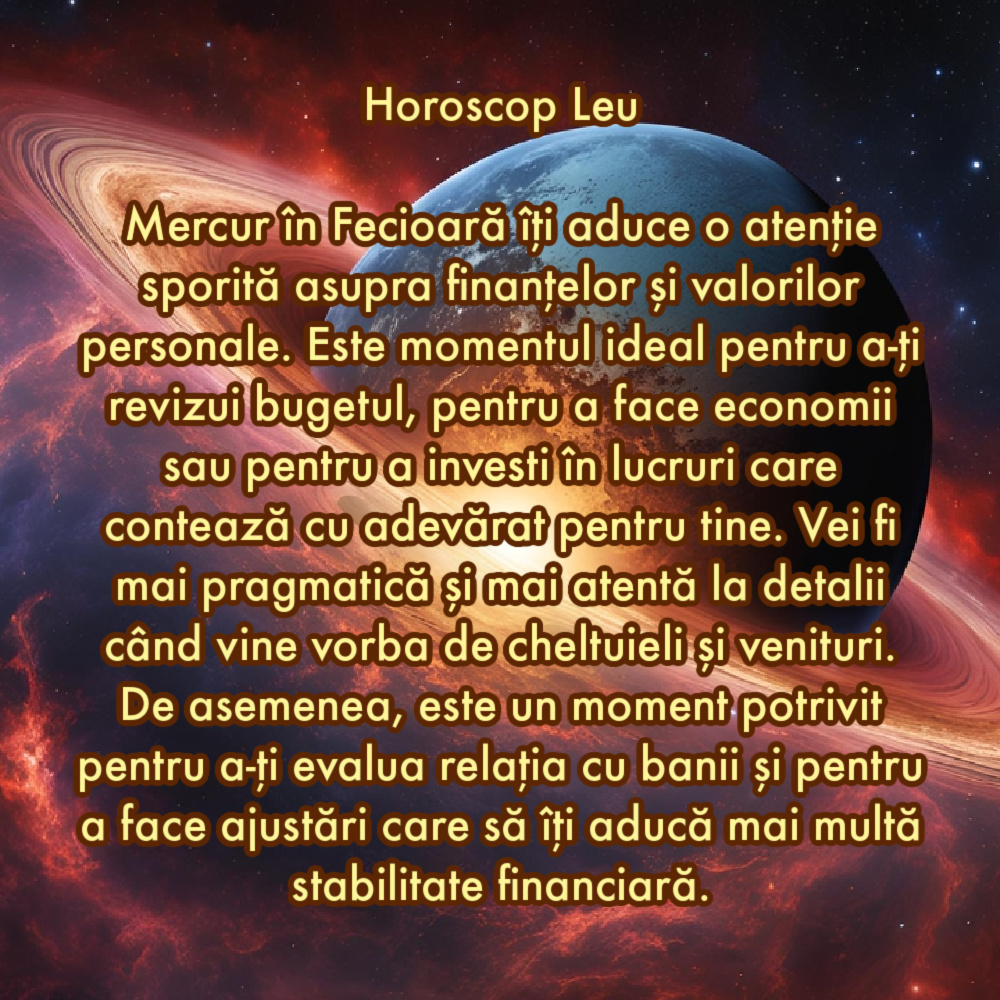 Mercur în Fecioară îți aduce o atenție sporită asupra finanțelor și valorilor personale. Este momentul ideal pentru a-ți revizui bugetul, pentru a face economii sau pentru a investi în lucruri care contează cu adevărat pentru tine. Vei fi mai pragmatică și mai atentă la detalii când vine vorba de cheltuieli și venituri. De asemenea, este un moment potrivit pentru a-ți evalua relația cu banii și pentru a face ajustări care să îți aducă mai multă stabilitate financiară.