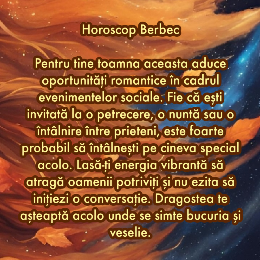 Pentru tine toamna aceasta aduce oportunități romantice în cadrul evenimentelor sociale. Fie că ești invitată la o petrecere, o nuntă sau o întâlnire între prieteni, este foarte probabil să întâlnești pe cineva special acolo. Lasă-ți energia vibrantă să atragă oamenii potriviți și nu ezita să inițiezi o conversație. Dragostea te așteaptă acolo unde se simte bucuria și veselie.