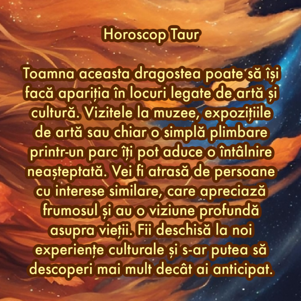 Pentru tine dragostea poate fi găsită în locuri legate de stabilitate și realizări. Evenimentele profesionale, întâlnirile de afaceri sau chiar un workshop de dezvoltare personală pot fi locurile ideale pentru a întâlni pe cineva special. O persoană care îți împărtășește ambițiile și valorile va reuși să te atragă în această toamnă. Fii deschisă la noi colaborări, deoarece acestea pot duce la conexiuni semnificative.