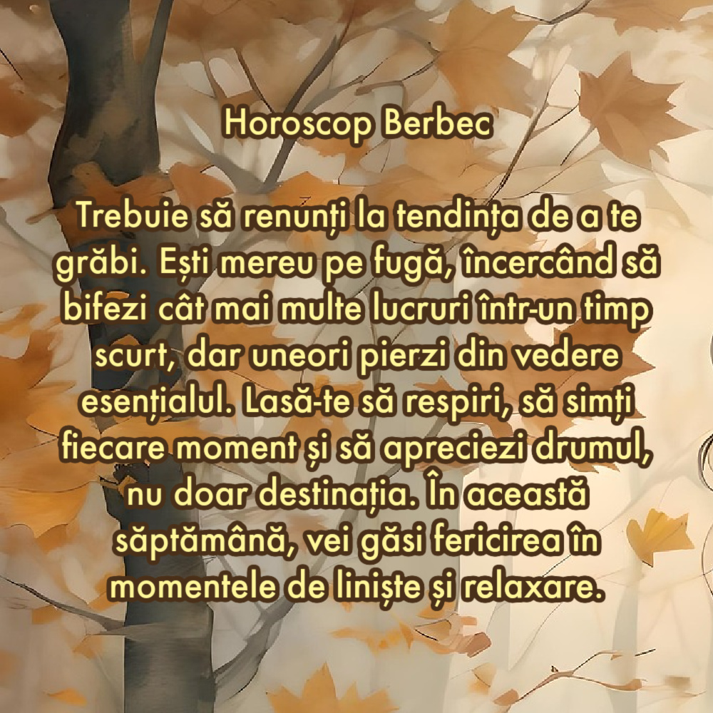 Trebuie să renunți la tendința de a te grăbi. Ești mereu pe fugă, încercând să bifezi cât mai multe lucruri într-un timp scurt, dar uneori pierzi din vedere esențialul. Lasă-te să respiri, să simți fiecare moment și să apreciezi drumul, nu doar destinația. În această săptămână, vei găsi fericirea în momentele de liniște și relaxare.