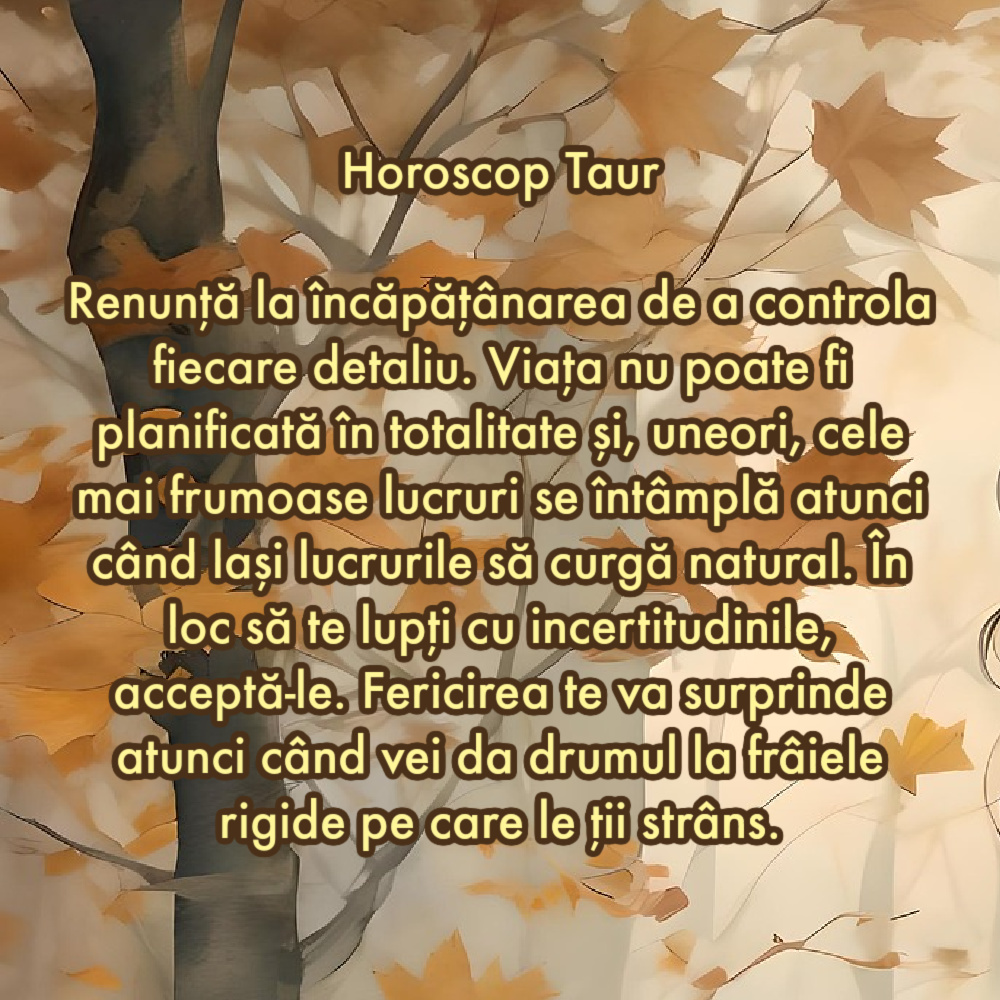Renunță la încăpățânarea de a controla fiecare detaliu. Viața nu poate fi planificată în totalitate și, uneori, cele mai frumoase lucruri se întâmplă atunci când lași lucrurile să curgă natural. În loc să te lupți cu incertitudinile, acceptă-le. Fericirea te va surprinde atunci când vei da drumul la frâiele rigide pe care le ții strâns.
