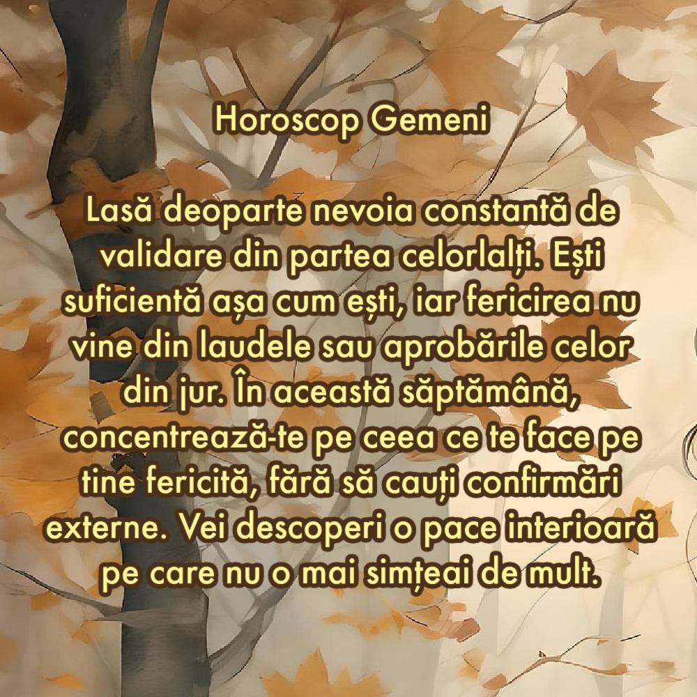Lasă deoparte nevoia constantă de validare din partea celorlalți. Ești suficientă așa cum ești, iar fericirea nu vine din laudele sau aprobările celor din jur. În această săptămână, concentrează-te pe ceea ce te face pe tine fericită, fără să cauți confirmări externe. Vei descoperi o pace interioară pe care nu o mai simțeai de mult.