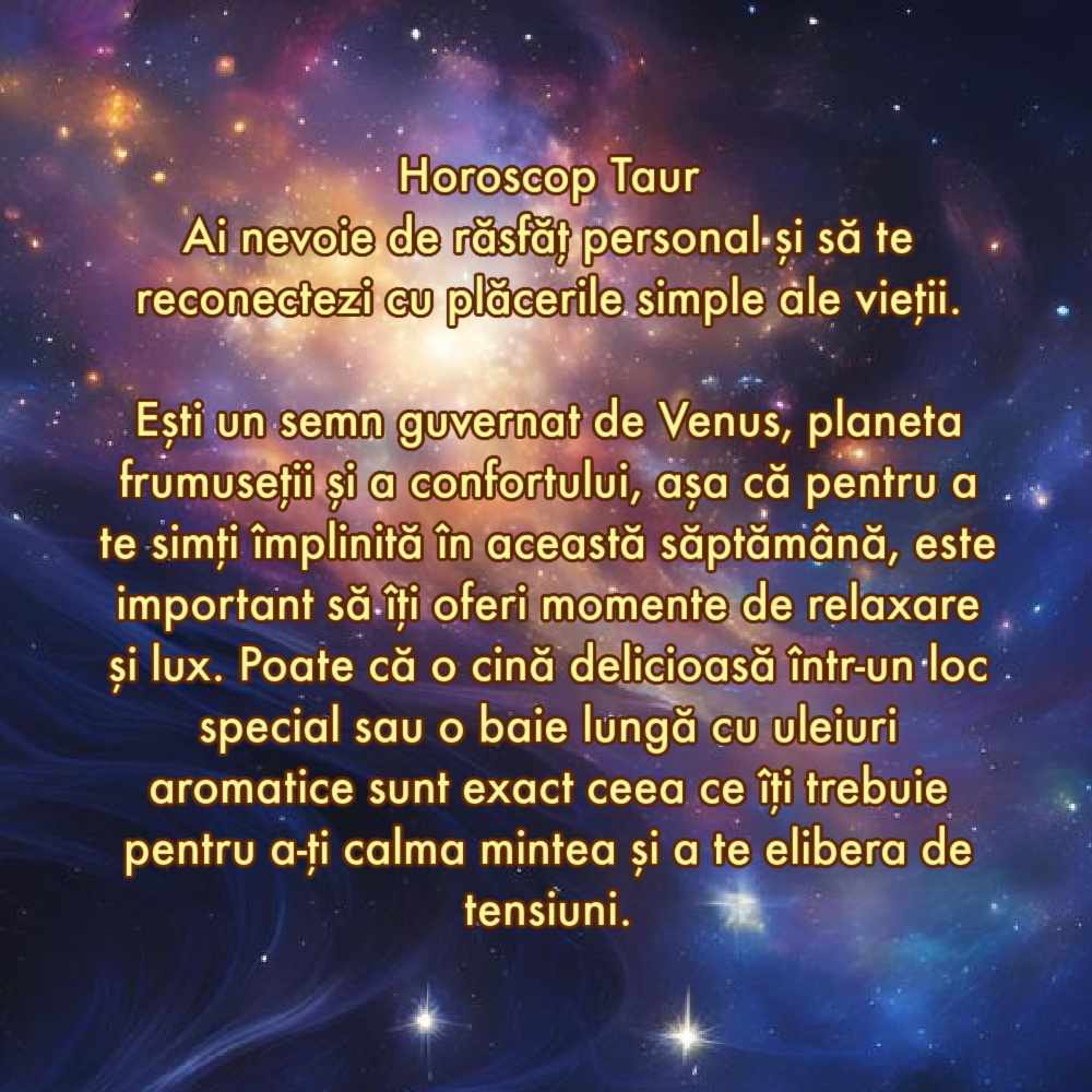 Ești un semn guvernat de Venus, planeta frumuseții și a confortului, așa că pentru a te simți împlinită în această săptămână, este important să îți oferi momente de relaxare și lux. Poate că o cină delicioasă într-un loc special sau o baie lungă cu uleiuri aromatice sunt exact ceea ce îți trebuie pentru a-ți calma mintea și a te elibera de tensiuni.