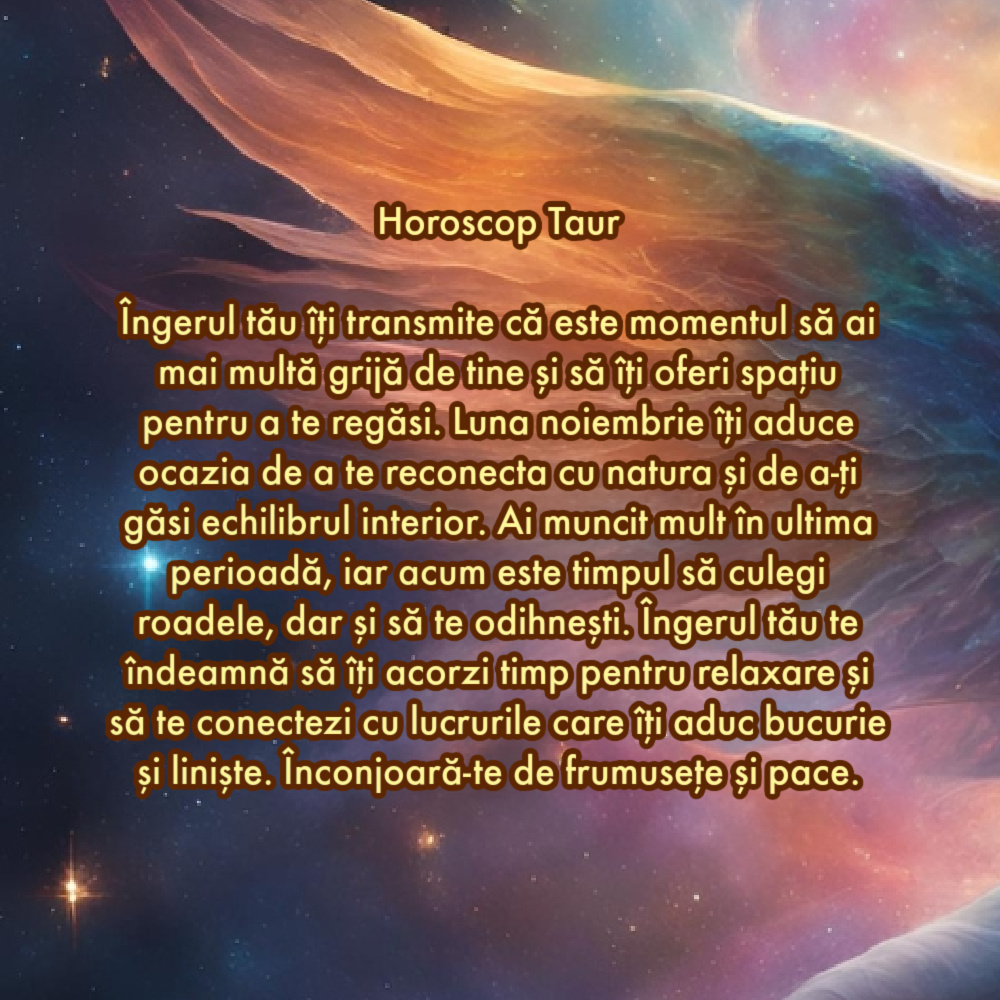 Îngerul tău îți transmite că este momentul să ai mai multă grijă de tine și să îți oferi spațiu pentru a te regăsi. Luna noiembrie îți aduce ocazia de a te reconecta cu natura și de a-ți găsi echilibrul interior. Ai muncit mult în ultima perioadă, iar acum este timpul să culegi roadele, dar și să te odihnești. Îngerul tău te îndeamnă să îți acorzi timp pentru relaxare și să te conectezi cu lucrurile care îți aduc bucurie și liniște. Înconjoară-te de frumusețe și pace.