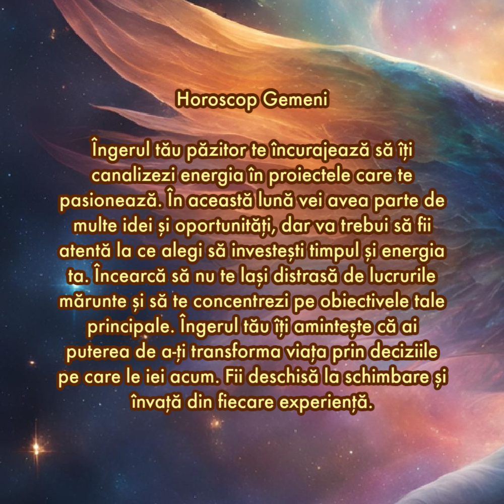Îngerul tău păzitor te încurajează să îți canalizezi energia în proiectele care te pasionează. În această lună vei avea parte de multe idei și oportunități, dar va trebui să fii atentă la ce alegi să investești timpul și energia ta. Încearcă să nu te lași distrasă de lucrurile mărunte și să te concentrezi pe obiectivele tale principale. Îngerul tău îți amintește că ai puterea de a-ți transforma viața prin deciziile pe care le iei acum. Fii deschisă la schimbare și învață din fiecare experiență.