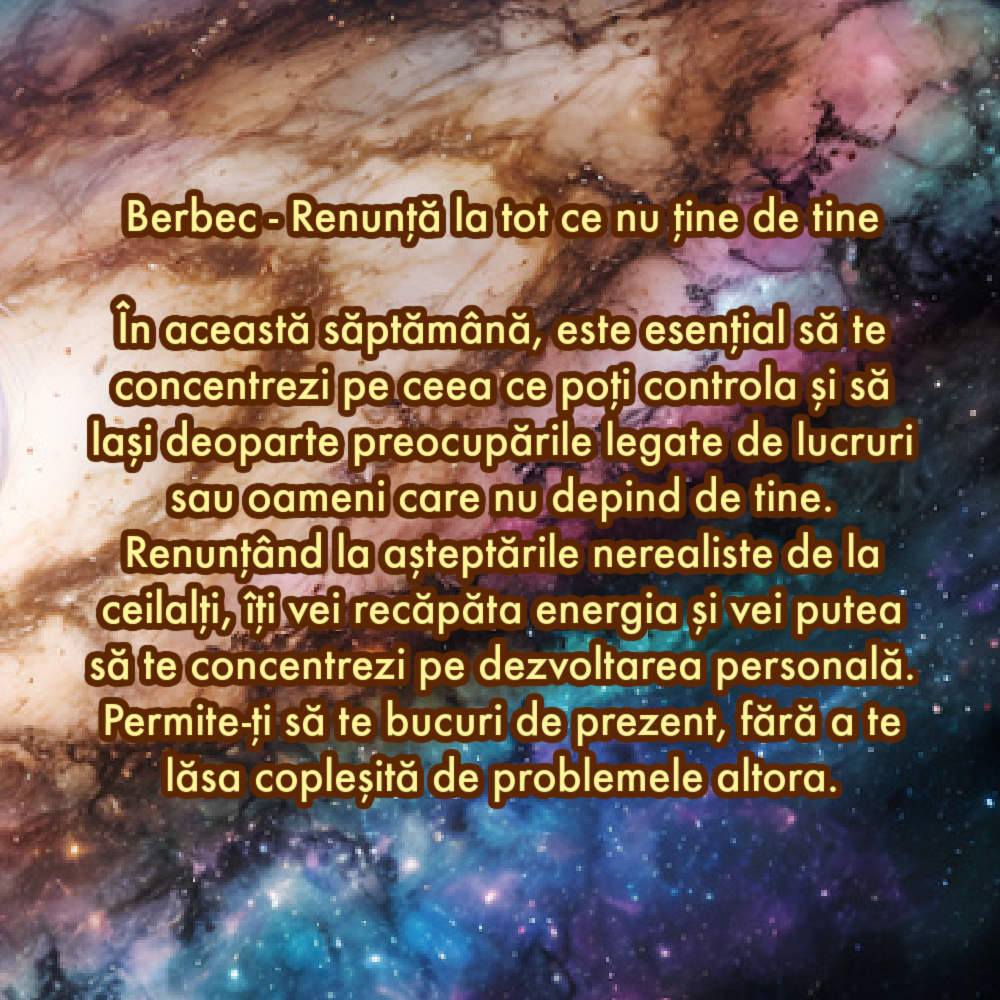 În această săptămână renunță la critica excesivă, atât față de tine, cât și față de ceilalți. Acceptă că fiecare are propriul drum și că greșelile sunt parte din evoluție. Renunțând la această critică, îți vei crea un mediu mai pozitiv și mai susținător. Începe să apreciezi eforturile tale și ale celor din jur.