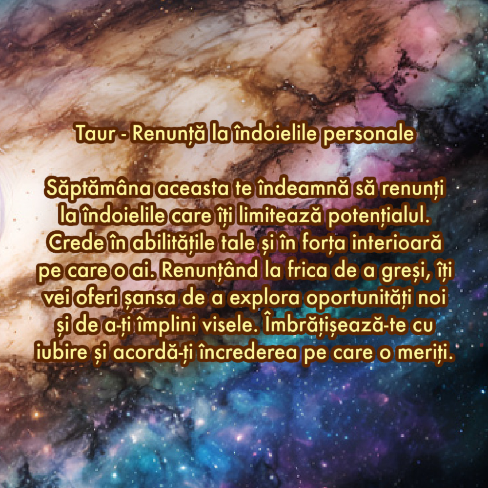 Săptămâna aceasta te îndeamnă să renunți la îndoielile care îți limitează potențialul. Crede în abilitățile tale și în forța interioară pe care o ai. Renunțând la frica de a greși, îți vei oferi șansa de a explora oportunități noi și de a-ți împlini visele. Îmbrățișează-te cu iubire și acordă-ți încrederea pe care o meriți.