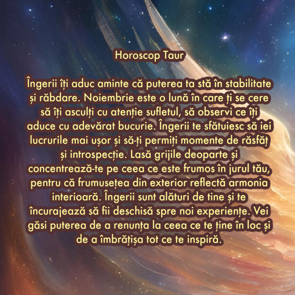 Îngerii îți aduc aminte că puterea ta stă în stabilitate și răbdare. Noiembrie este o lună în care ți se cere să îți asculți cu atenție sufletul, să observi ce îți aduce cu adevărat bucurie. Îngerii te sfătuiesc să iei lucrurile mai ușor și să-ți permiți momente de răsfăț și introspecție. Lasă grijile deoparte și concentrează-te pe ceea ce este frumos în jurul tău, pentru că frumusețea din exterior reflectă armonia interioară. Îngerii sunt alături de tine și te încurajează să fii deschisă spre noi experiențe. Vei găsi puterea de a renunța la ceea ce te ține în loc și de a îmbrățișa tot ce te inspiră.