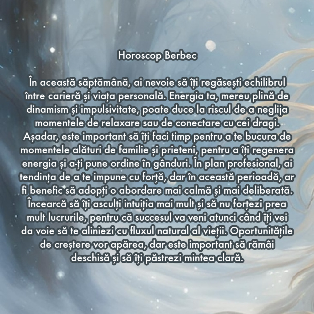 În această săptămână, ai nevoie să îți regăsești echilibrul între carieră și viața personală. Energia ta, mereu plină de dinamism și impulsivitate, poate duce la riscul de a neglija momentele de relaxare sau de conectare cu cei dragi. Așadar, este important să îți faci timp pentru a te bucura de momentele alături de familie și prieteni, pentru a îți regenera energia și a-ți pune ordine în gânduri. În plan profesional, ai tendința de a te impune cu forță, dar în această perioadă, ar fi benefic să adopți o abordare mai calmă și mai deliberată. Încearcă să îți asculți intuiția mai mult și să nu forțezi prea mult lucrurile, pentru că succesul va veni atunci când îți vei da voie să te aliniezi cu fluxul natural al vieții. Oportunitățile de creștere vor apărea, dar este important să rămâi deschisă și să îți păstrezi mintea clară.
