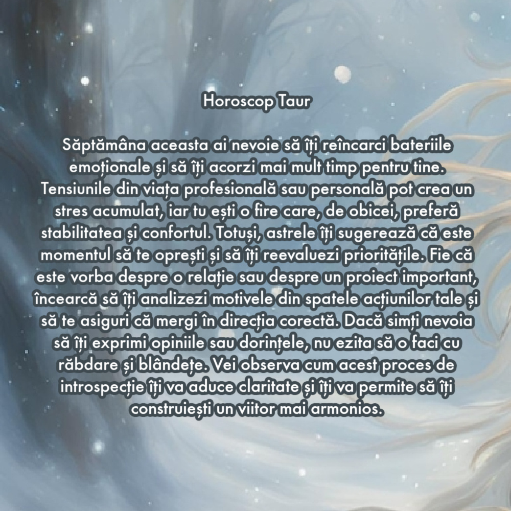 Săptămâna aceasta ai nevoie să îți reîncarci bateriile emoționale și să îți acorzi mai mult timp pentru tine. Tensiunile din viața profesională sau personală pot crea un stres acumulat, iar tu ești o fire care, de obicei, preferă stabilitatea și confortul. Totuși, astrele îți sugerează că este momentul să te oprești și să îți reevaluezi prioritățile. Fie că este vorba despre o relație sau despre un proiect important, încearcă să îți analizezi motivele din spatele acțiunilor tale și să te asiguri că mergi în direcția corectă. Dacă simți nevoia să îți exprimi opiniile sau dorințele, nu ezita să o faci cu răbdare și blândețe. Vei observa cum acest proces de introspecție îți va aduce claritate și îți va permite să îți construiești un viitor mai armonios.