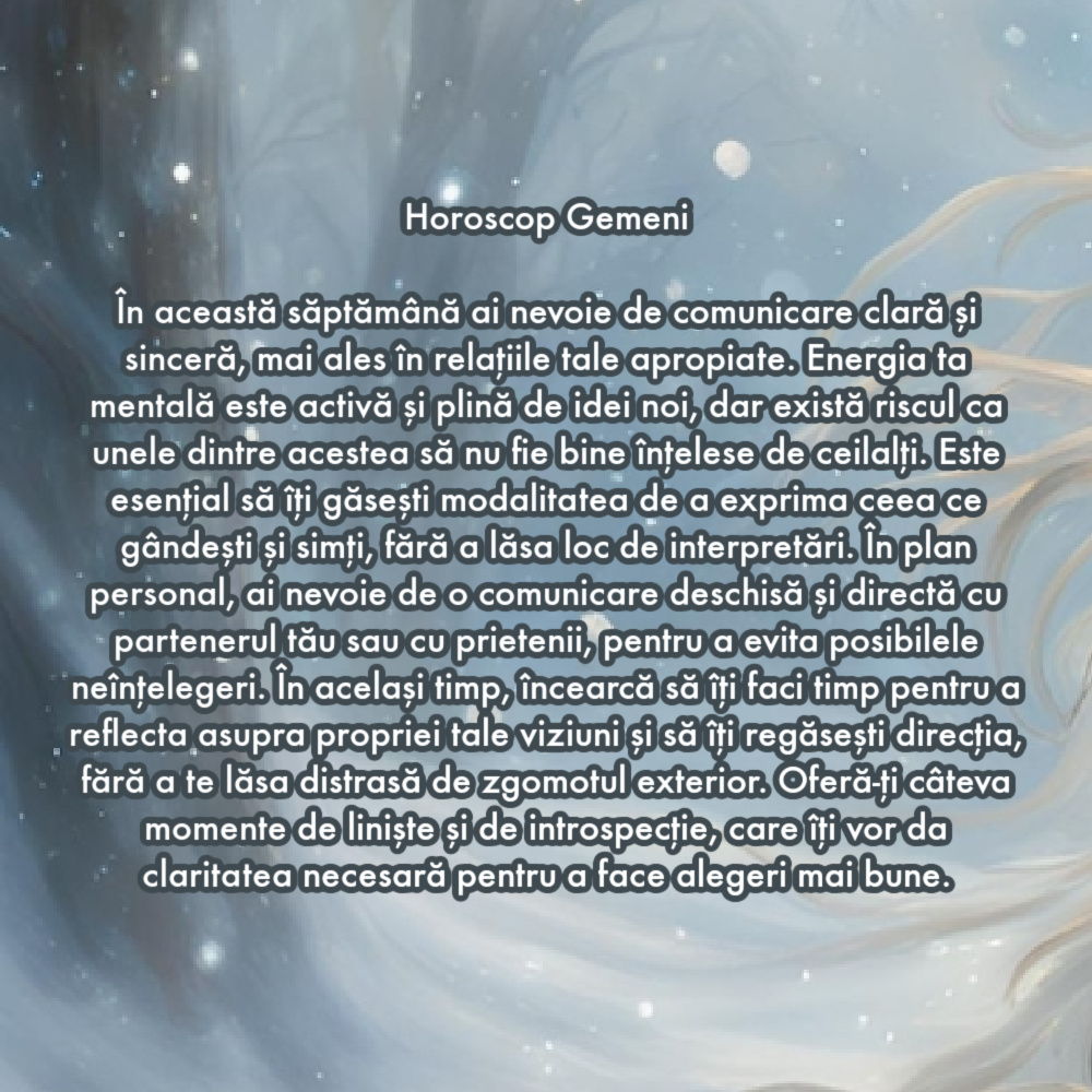 În această săptămână ai nevoie de comunicare clară și sinceră, mai ales în relațiile tale apropiate. Energia ta mentală este activă și plină de idei noi, dar există riscul ca unele dintre acestea să nu fie bine înțelese de ceilalți. Este esențial să îți găsești modalitatea de a exprima ceea ce gândești și simți, fără a lăsa loc de interpretări. În plan personal, ai nevoie de o comunicare deschisă și directă cu partenerul tău sau cu prietenii, pentru a evita posibilele neînțelegeri. În același timp, încearcă să îți faci timp pentru a reflecta asupra propriei tale viziuni și să îți regăsești direcția, fără a te lăsa distrasă de zgomotul exterior. Oferă-ți câteva momente de liniște și de introspecție, care îți vor da claritatea necesară pentru a face alegeri mai bune.