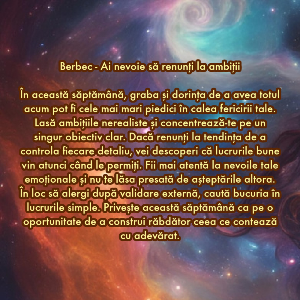 În această săptămână, graba și dorința de a avea totul acum pot fi cele mai mari piedici în calea fericirii tale. Lasă ambițiile nerealiste și concentrează-te pe un singur obiectiv clar. Dacă renunți la tendința de a controla fiecare detaliu, vei descoperi că lucrurile bune vin atunci când le permiți. Fii mai atentă la nevoile tale emoționale și nu te lăsa presată de așteptările altora. În loc să alergi după validare externă, caută bucuria în lucrurile simple. Privește această săptămână ca pe o oportunitate de a construi răbdător ceea ce contează cu adevărat.