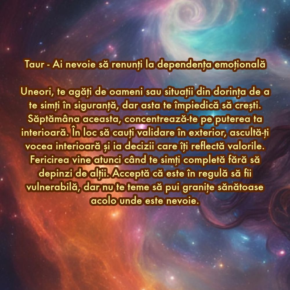 Uneori, te agăți de oameni sau situații din dorința de a te simți în siguranță, dar asta te împiedică să crești. Săptămâna aceasta, concentrează-te pe puterea ta interioară. În loc să cauți validare în exterior, ascultă-ți vocea interioară și ia decizii care îți reflectă valorile. Fericirea vine atunci când te simți completă fără să depinzi de alții. Acceptă că este în regulă să fii vulnerabilă, dar nu te teme să pui granițe sănătoase acolo unde este nevoie.