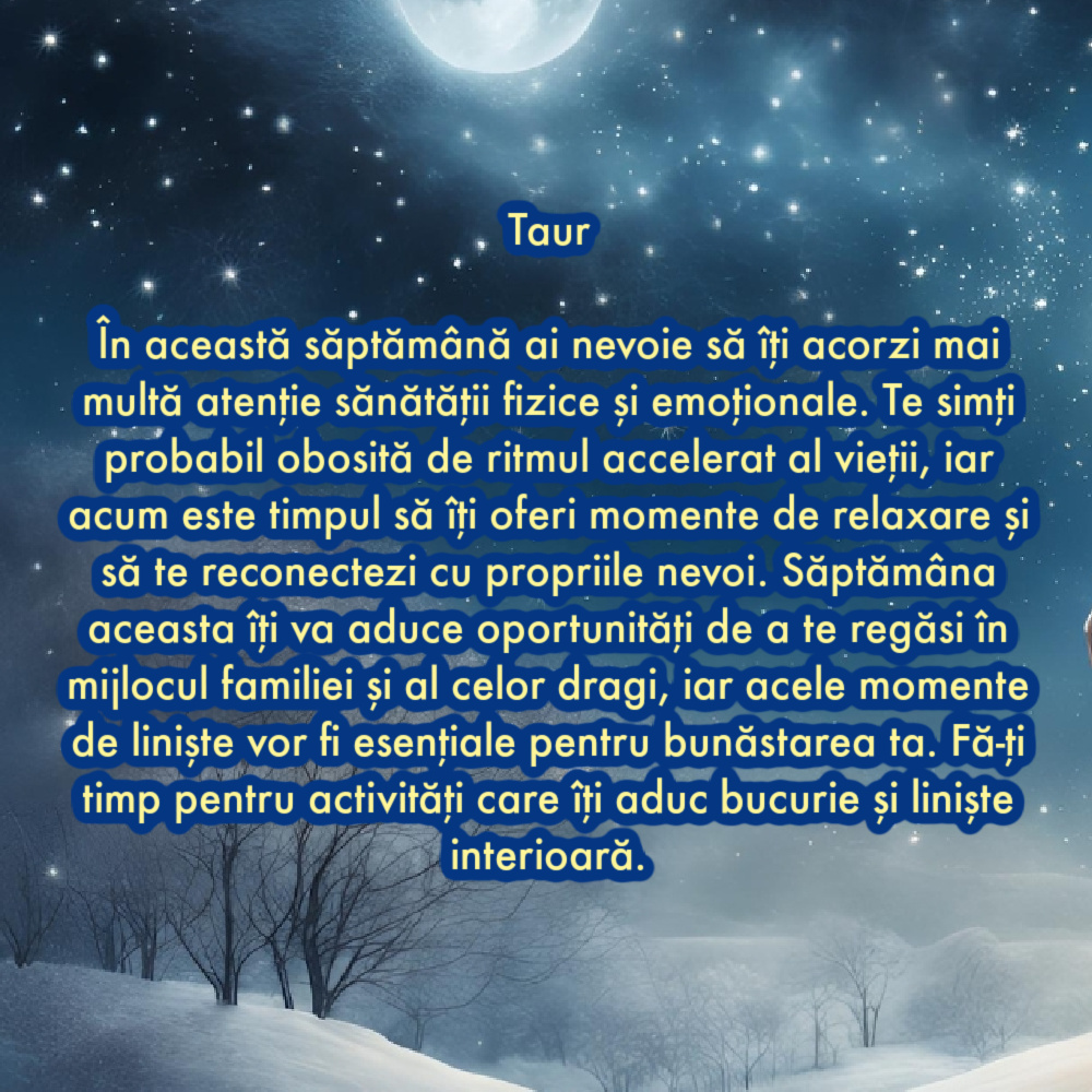 În această săptămână ai nevoie să îți acorzi mai multă atenție sănătății fizice și emoționale. Te simți probabil obosită de ritmul accelerat al vieții, iar acum este timpul să îți oferi momente de relaxare și să te reconectezi cu propriile nevoi. Săptămâna aceasta îți va aduce oportunități de a te regăsi în mijlocul familiei și al celor dragi, iar acele momente de liniște vor fi esențiale pentru bunăstarea ta. Fă-ți timp pentru activități care îți aduc bucurie și liniște interioară.