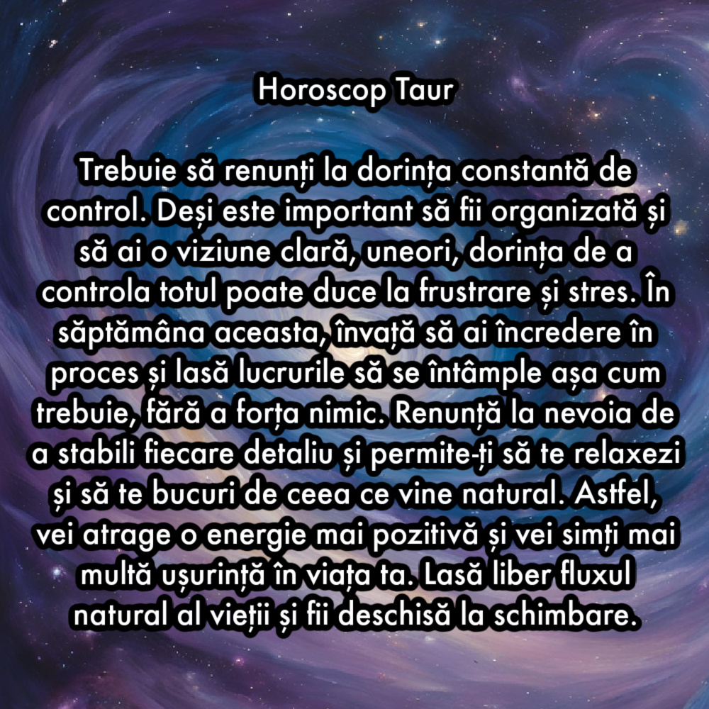 Trebuie să renunți la dorința constantă de control. Deși este important să fii organizată și să ai o viziune clară, uneori, dorința de a controla totul poate duce la frustrare și stres. În săptămâna aceasta, învață să ai încredere în proces și lasă lucrurile să se întâmple așa cum trebuie, fără a forța nimic. Renunță la nevoia de a stabili fiecare detaliu și permite-ți să te relaxezi și să te bucuri de ceea ce vine natural. Astfel, vei atrage o energie mai pozitivă și vei simți mai multă ușurință în viața ta. Lasă liber fluxul natural al vieții și fii deschisă la schimbare.
